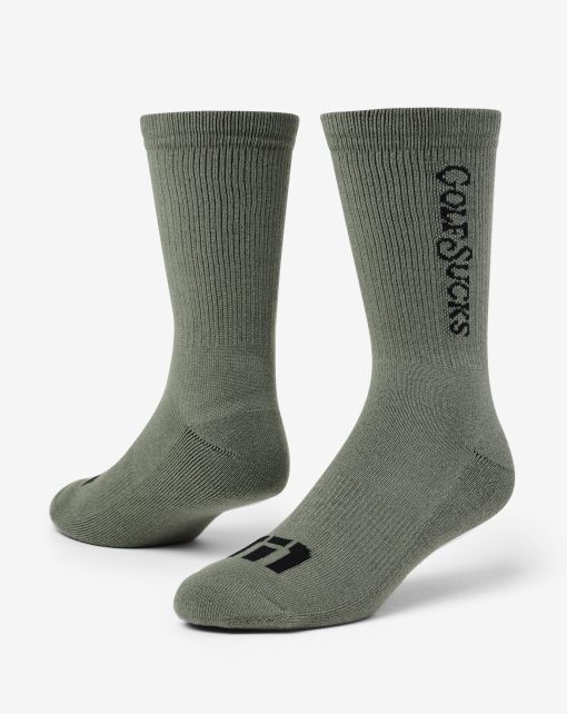 With an ultra-cushioned sole and no-slip cuff, the GOLF SUCKS CREW sock delivers support and breathability, accented by bold “Golf Sucks” wording and our signature TM logo across wearable, seasonal colorways.