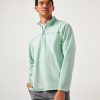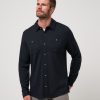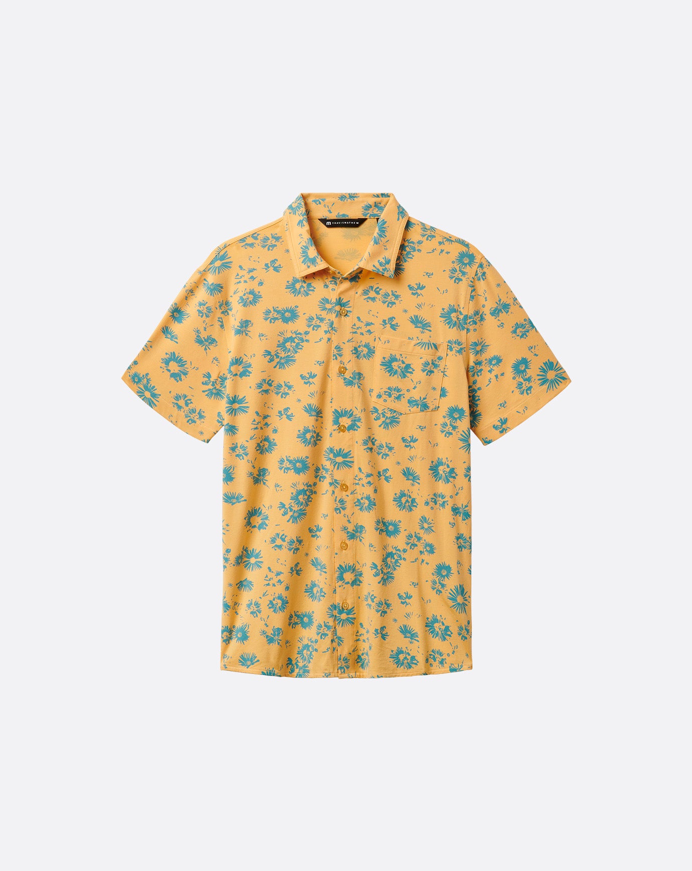 - TravisMathew block logo embroidery on lower inside placket