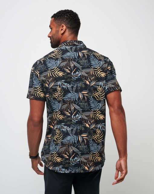 - TravisMathew block logo embroidery on lower inside placket