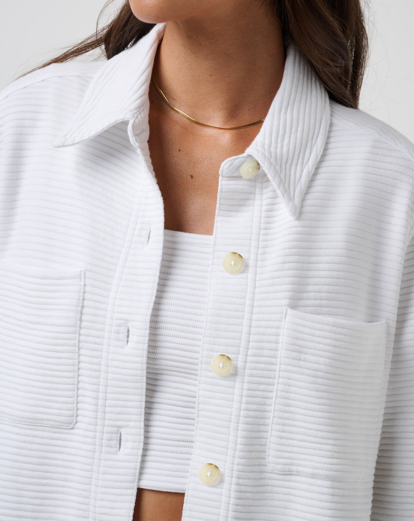 You know that perfectly soft, super comfortable set you loved last year? The one with the wear-everywhere ribbed texture that holds its shape all day long? Well, we heard you were a fan… so we made a new button-up shacket style in a thicker fabric that feels like heaven. Designed with a shirt tail hem and front patch pockets, the YACHT ME SHACKET is that dress-up, dress-down staple you’ll throw on for coastal strolls, nights out, and whatever other excuses you can come up with to strut it around.