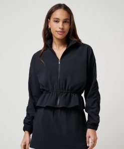 - Textured zip peplum jacket / relaxed fit / interior pocket on wearers left chest/elastic waistband